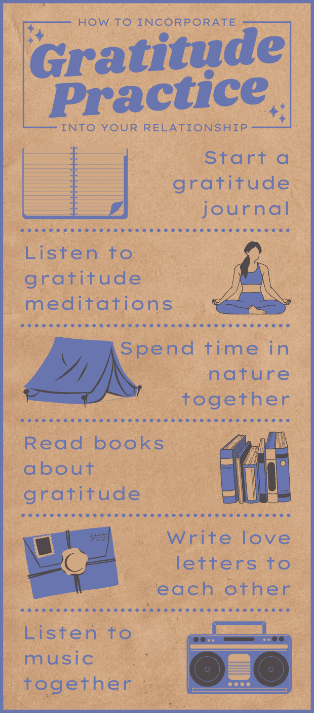 These are just a few ways to explore incorporating gratitude practice into your relationship. You may even be surprised to find you already do some of these activities together.